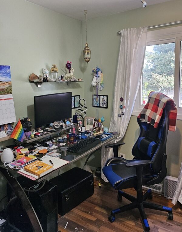 SM: It looks like a jumble of sparkly rocks, brightly colored art, toys, and candles, but itâs actually really organized for me and I know where everything is.